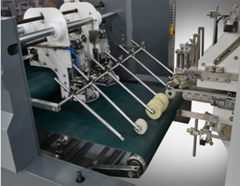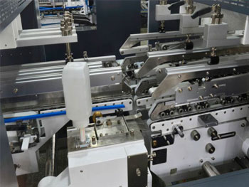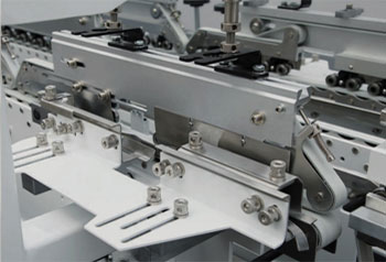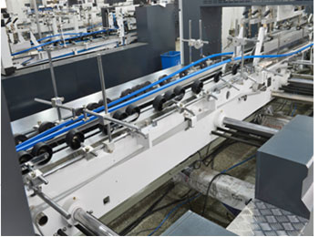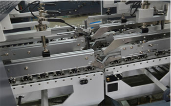 二,四線180度結合(hé),本折部左右輸(shū)送,拐帶速度可(ke)單獨調節,及糾(jiū)正盒坯行走方(fang)向,..直線輸送